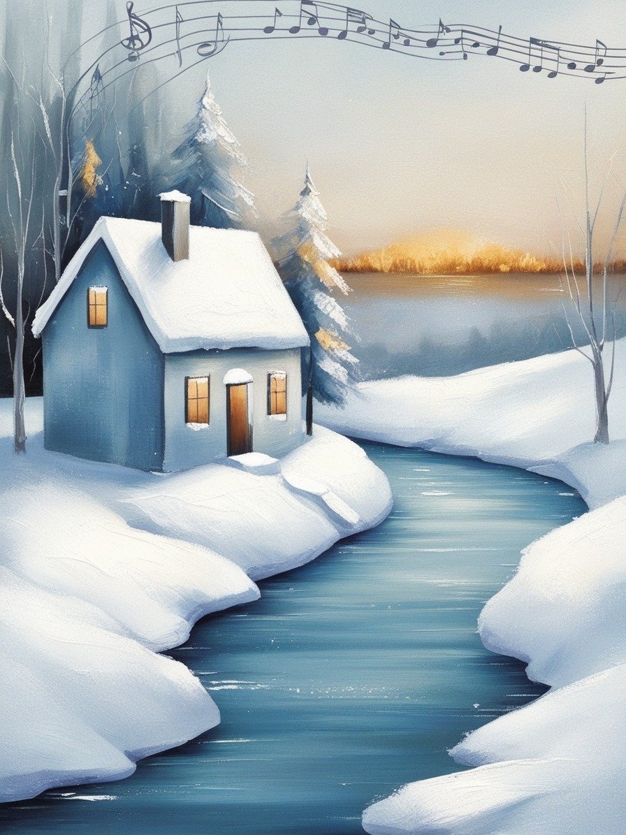 A tranquil painting that captures the timeless beauty of nature. Towering mountains rise gracefully in the background, their peaks softened by a gentle haze. At the foothills, a small house rests peacefully, surrounded by lush greenery and open space. The quiet charm of the home against the grandeur of the mountains evokes a sense of calm, solitude, and harmony with nature. This serene artwork invites the viewer to pause, breathe deeply, and imagine the stillness of life embraced by the mountains.